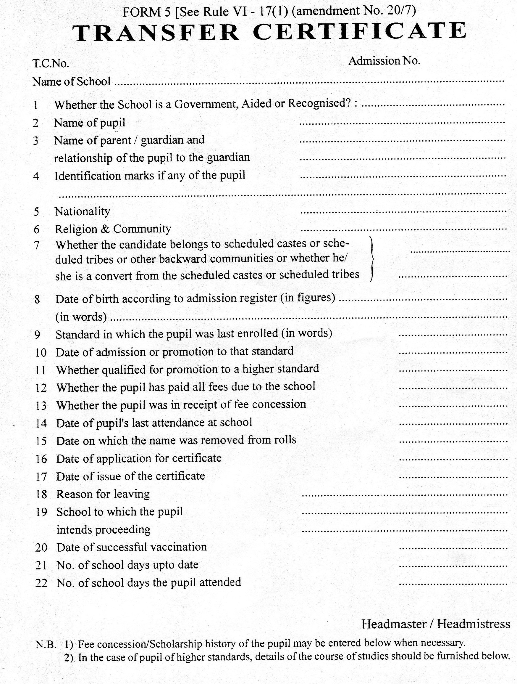 TRANSFER CERTIFICATE
